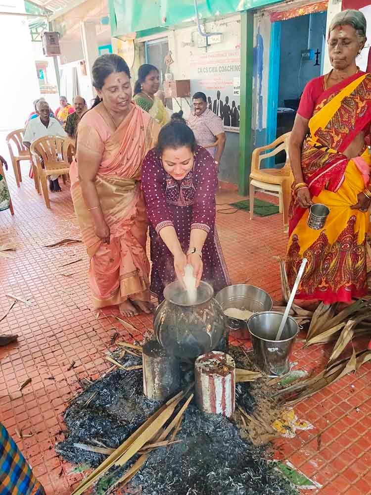 Age group 66-70 occupied Happy Kitchen, Age group 61-65 in front of Smt. Seethalakshmi building and 60 &below at the entrance all enjoyed making Rangoli. Delicious traditional Pongal, Sakarapongal and Pongal village Kuzhambu were prepared and served. Sh Kannan Bhattar performed puja. Elders prayed for goodness of all and healthy life. They also thanked Surya Bhagwan and farmers for cultivating and growing rice and other eatables. Elders blessed others and echoed Pongal O Pongal.
